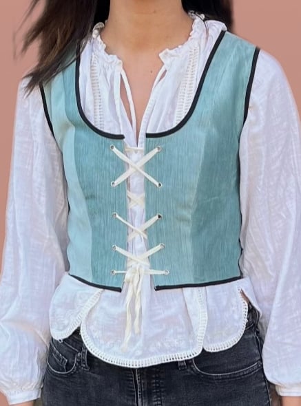 This Tristan top is lined and had bias binding applied to the neck hole, armholes, and hem. It laces in the front to make it easier to wear. This top is technically reversible, although the eyelets are a bit rough on the back side. The boning used is lightweight plastic boning. It gives a nice amount of structure, and support for the lacing.
