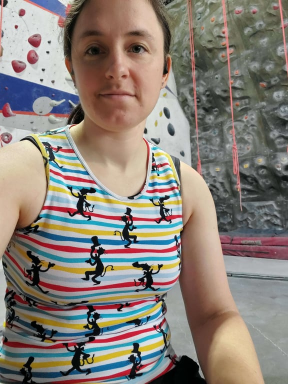 "I've been making Aarons! I want to use them as undershirts so I've pulled the armholes up very high (-12% if I remember right, for sweat catching reasons) and I need to bring the neckline down so that it'll still be below any buttons I like to leave undone. This one is great for today's gym trip though!"