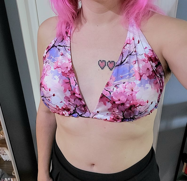 A bikini with a sakura-flower pattern I quickly made, around 2h, with the bee pattern in order to try the site out. Could have been done more carefully, but seeing how it still turned this good just shows how good the pattern is!