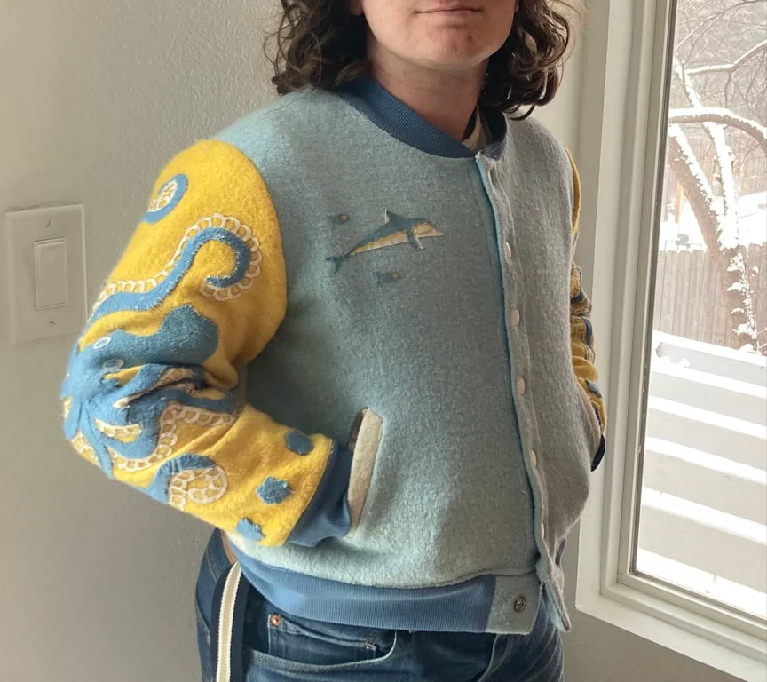 Front view of a blue and yellow jacket, with a dolphin and fish appliqued on the front and a blue octopus on the sleeve