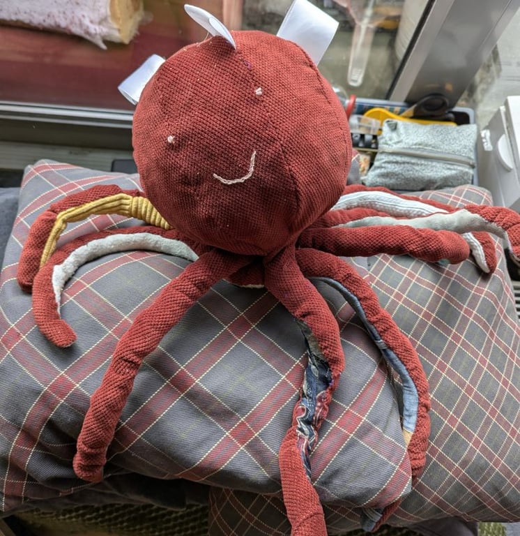 Two pairs of friends of mine are having babies soon, so I figured I'd make plushies for their newborns! We just replaced our old couches and the old ones were really not suitable for use by anyone, anymore, so they were due for the dump. The fabric of the cushions was still in good shape, though, and the filling of the cushions was perfect for a plushie, too. Still, it took a lot of effort to make this—the second plushie will have shorter and thicker tentacles.