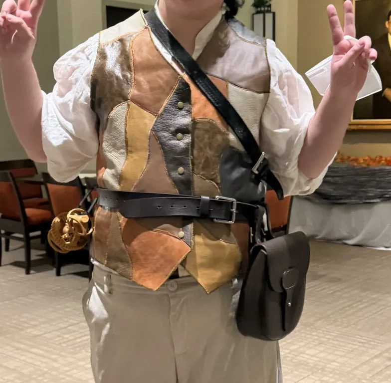 I made a Wahid out of scrap leather for my LARP character (you can kinda see my 3d printed artificer artifact puzzle in the photo lol)! I made a single layer mock up with cotton canvas and tailored it to fit tightly, and cut pieces of leather scrap and glued + basted them to the wrong side, covering the darts to sculpt it to my body shape. I covered the gaps between the edges of pieces with a wide and tight zig zag stitch using multiple shades of brown to give a mossy/bark-like look and finished with heavy duty snaps for the closure! This is my third Wahid and I'm pretty happy with how it turned out and it worked really well for the LARP:)