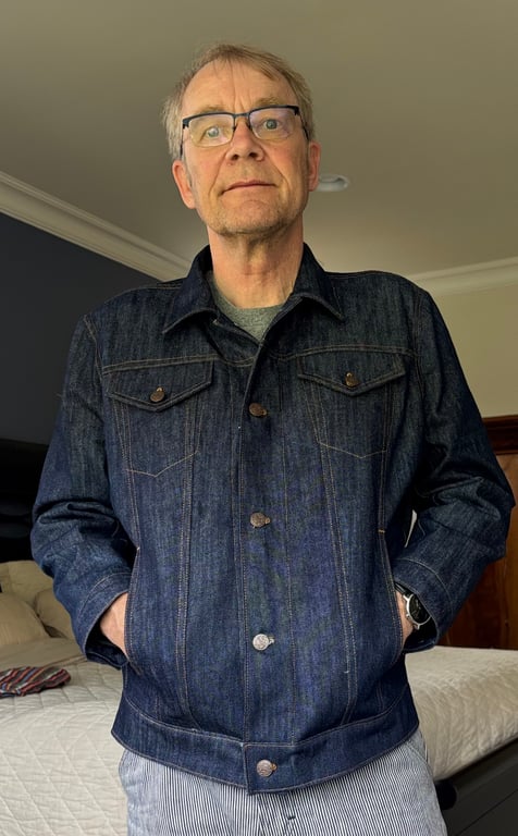 This is the first devon I made after all the tweaks were made to the design. Standard weight denim like you would use in a pair of jeans, or a denim jacket.